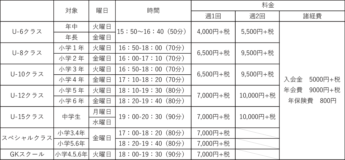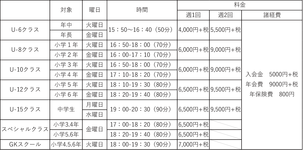 「楽しく上手くなろう」をスローガンに指導育成していきます。 また選手一人一人の個性を大事にした指導を行っていきます。 ◆ジュニアサッカースクール ※各クラス内ともに選手の能力に応じて、更にクラス分けしてトレーニングをする場合があります。 ※上記に+税がかかります。 <送迎について> 送迎対応できる範囲内で行います。 ※地域、乗車人数等
